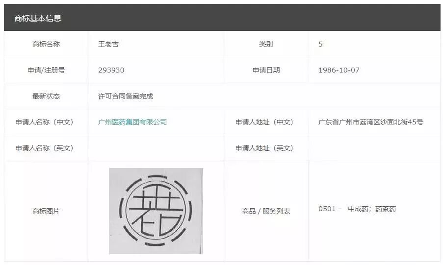 查询可得,王老吉最初由广药集团于1986年申请注册成功,注册类别是「0501-中成药;药茶药」。